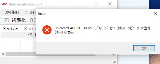 Bridgemateの使用、及び新機能の使用済みハンド登録・照合機能を使用するには 「Microsoft.ACE.OLEDB.12.0」のインストールが必要です※。Bridgemateの初期化がエラーなく完了する場合は既にインストールされていますので対応不要です(最新のWindowsには初期インストールされています)。 インストールされていない場合はBridgemate初期化時に下のエラーとなります。